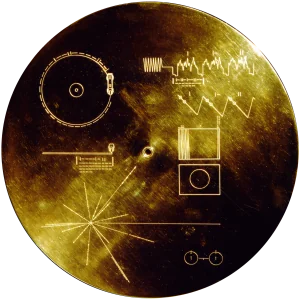 Seit fast 40 Jahren ist die „Golden Record“ mit der Voyager2-Mission im All. Darauf sind Grüße, ein paar Tonaufnahmen und Bilder. Aber natürlich nicht Wikipedia. (Bild: public domain)