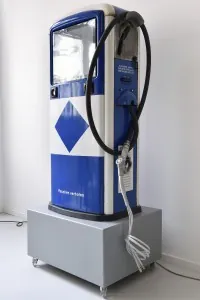 Die Datentankstelle hatte in ihrer ersten Existenz das Baujahr 1962 und lieferte wie tausende ihrer Kolleginnen Aral-Benzin an zahlende Kunden. Wir haben sie Ende 2013 erworben und entkernen lassen. Ein feiner Tankstellengeruch umgibt sie immer noch. Im Inneren der Datentankstelle steht ein handelsüblicher PC mit mehreren Festplatten und Ubuntu. Auf einer Seite wurde die analoge Anzeige für Preis und Menge des getankten Benzis ersetzt durch einen Touchscreen. Aus dem Zapfventil kommen vier Netzwerkkabel zum Anschließen eigener Geräte. Mitgebrachte USB-Sticks können an der Seite der Zapfsäule angeschlossen werden. Der Datentankende wählt über das Display die gewünschen Datensets aus und startet den Zapfvorgang.