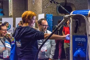 Jimmy Wales an der Datentankstelle am WMDE-Stand auf der Wikimania 2014 [Foto: Sebastian Sooth (WMDE), CC-BY-SA 4.0]