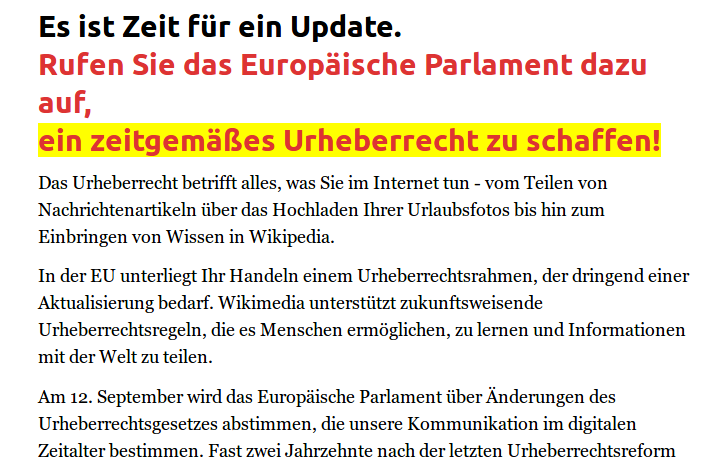Bravo, richtig so! Es ist auch wichtig, zu betonen, dass die Ausnahme für »unkommerzielle Online-Enzyklopädien« (als ob es davon so viele gäbe, haha!) in der Praxis wohl nicht viel bringt. Wikimedia Commons und Wikidata sind auch sehr wichtig. Und natürlich werden auch andere Projekte, die stark vom Benutzerinput abhängen, empfindlich getroffen, wie z.B. OpenStreetMap. Die deutsche OSM-Karte ist momentan übrigensauch teilweise schwarz: https://www.openstreetmap.de/uf/ Diese eine Ausnahme wurde doch damals von Wikipedia-Lobbyisten hart erkämpft. Nur deshalb gibt es sie überhaupt. Ich finde daher die Argumentation der Verleger mehr als heuchlerisch. Vielleicht war das Erkämpfen der Ausnahme damals ein taktischer Fehler gewesen, denn jetzt können die Feinde der Freiheit immer wieder darauf rumreiten und so tun, als wäre alles nicht so schlimm. :-/