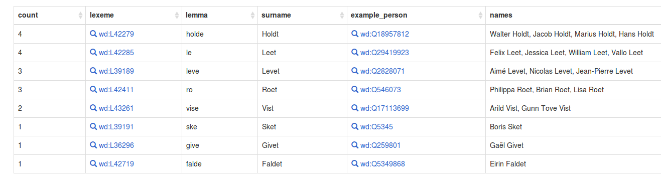 Natürlich können lexikographische Daten auch abgefragt werden. Ein interessantes Beispiel für die Vernetzungen, die Lexeme in Wikidata ermöglichen, ist diese Abfrage von Finn Årup Nielsen, die nach Personen mit Nachnamen sucht, die der Vergangenheitsform eines dänischen Verbs entsprechen.