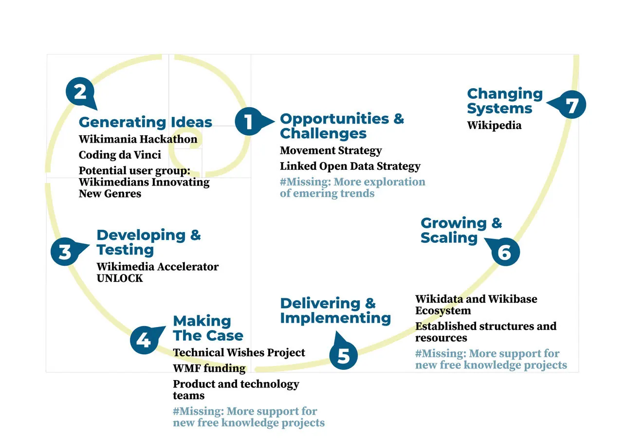 Wir konnten feststellen, dass es Strukturen und Prozesse gibt, die die Entwicklung bestehender Wikimedia-Projekte unterstützen. Zum Beispiel kann sich die technische Community sich beim jährlichen Wikimania Hackathon versammeln und sich an der Entwicklung von MediaWiki und viele andere Bereiche im technischen Ökosystem der Wikimedia beteiligen. Weitere Ideen und Prototypen, die sich auf bestehende Wikimedia-Projekte beziehen, können aufgrund bereits vorhandener Strukturen leichter in das bestehende Ökosystem integriert werden. Dies zeigt sich in der Entwicklung von Wikidata, Wikibase Ecosystem, Wikimedia Commons und weiteren Wikimedia-Projekten.