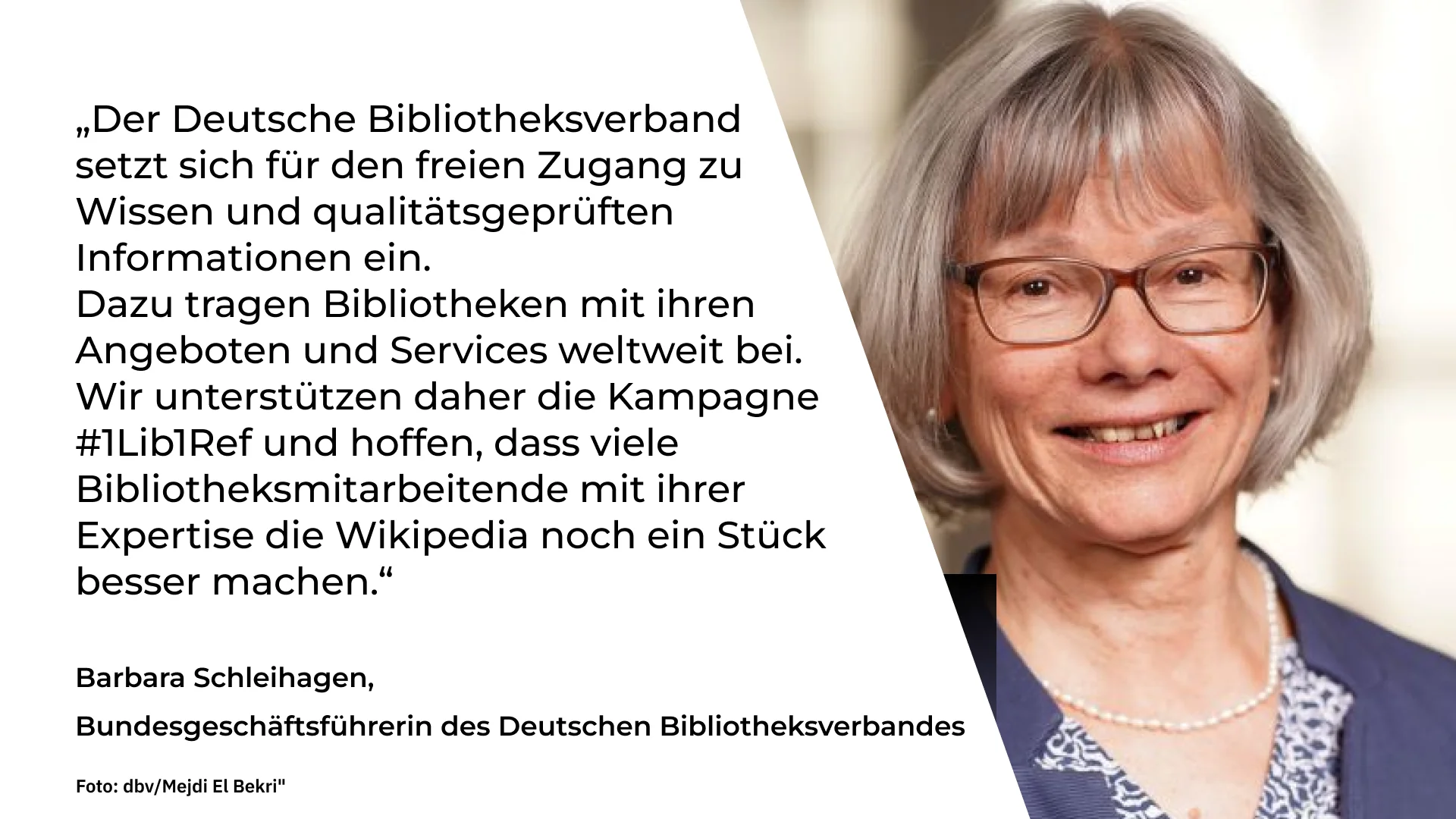 Um die Qualität der Inhalte in den mehr als 300 Sprachversionen des Projekts stetig weiter zu verbessern, findet zweimal jährlich die Kampagne #1Lib1Ref statt (one librarian, one reference – ein*e Bibliothekar*in, eine Referenz). Frei nach dem Motto des Wikipedia-Gründers Jimmy Wales („Stell dir eine Welt vor, in der jeder Mensch auf dem Planeten freien Zugang zur Summe des Wissens hat“) regt die Initiative an: „Stell dir eine Welt vor, in der jede Bibliothekarin und jeder Bibliothekar der Wikipedia eine Literaturangabe mehr hinzufügt“.
