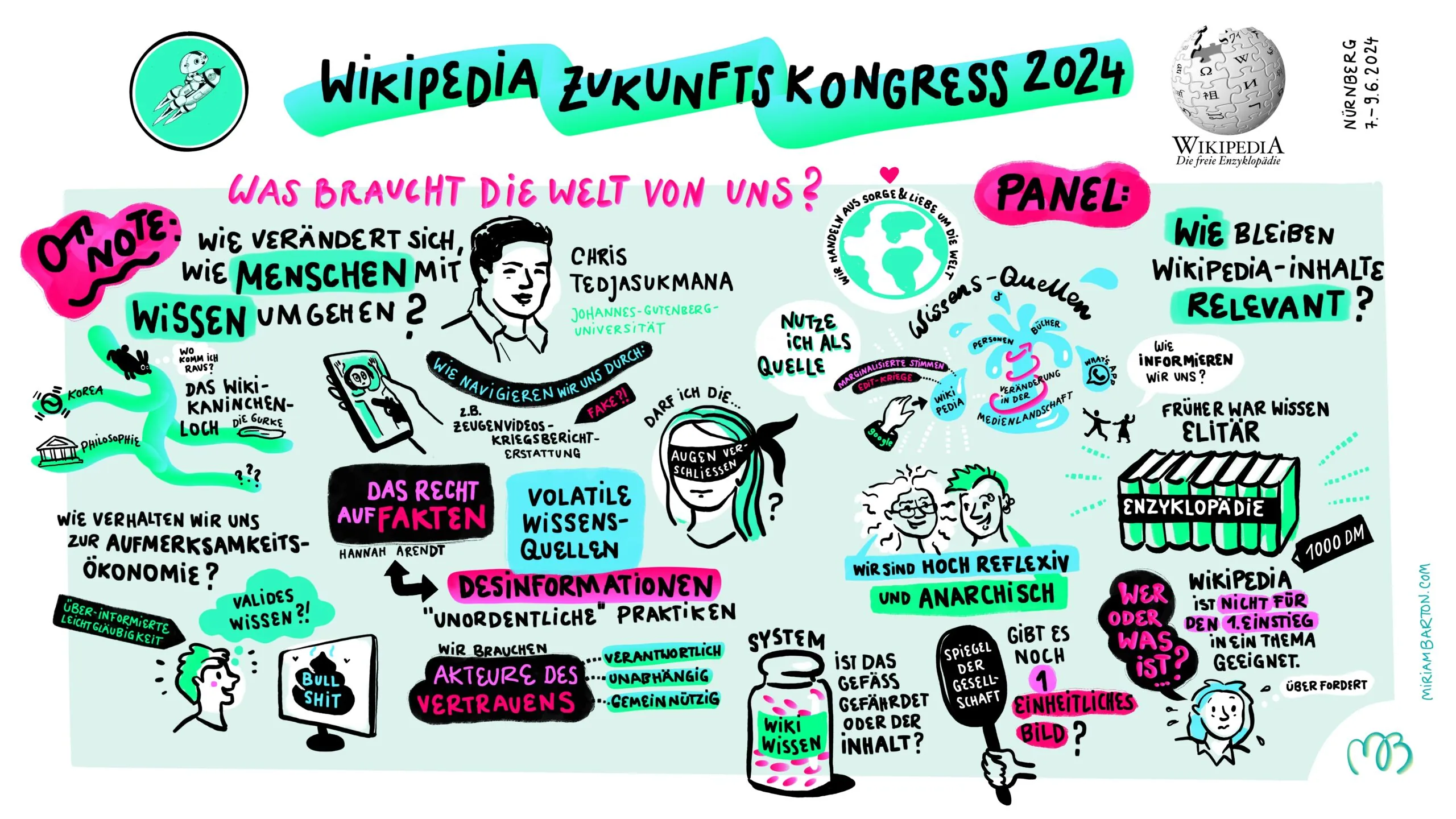 Demgegenüber stehen viele Ideen für Veränderungen, die in verschiedenen Workshops am letzten Tag des Zukunftskongresses gesammelt wurden – und die viele Impulse aus den Keynotes und Panels wieder aufgriffen: KI-Tools etwa könnten gerade Neu-Autor*innen den Einstieg in die Wikipedia-Arbeit erleichtern, Übersetzungen von Texten in andere Sprachversionen erstellen, Schaubilder erzeugen oder auch helfen, Wikipedia-Versionen in einfacher Sprache zu erstellen, ohne dabei den Menschen überflüssig zu machen, der die Informationen verlässlich aufbereitet.