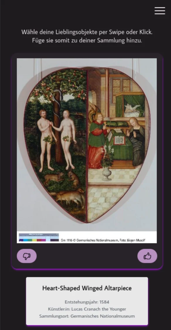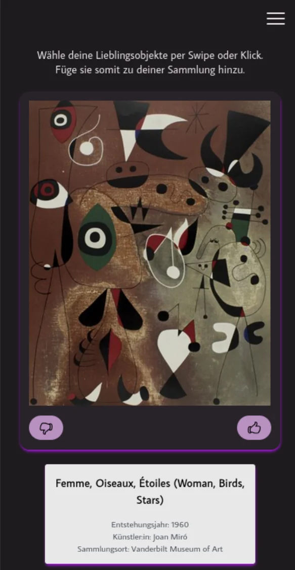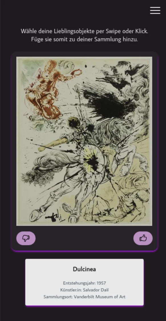 Die Anwendung zeigt uns eine zufällige Auswahl von digitalisierten Gemälden, Drucken, Skulpturen oder Fotografie aus europäischen Sammlungen. Gefällt ein Bild, wird es nach rechts gewischt und der eigenen Sammlung hinzugefügt; gefällt es nicht, geht es nach links, danach erscheint ein neues Objekt. Willkommen beim Kunstwerke-Tinder!